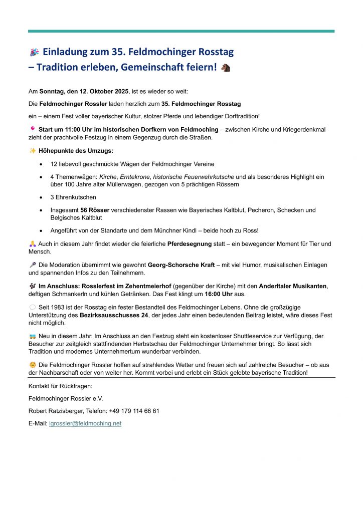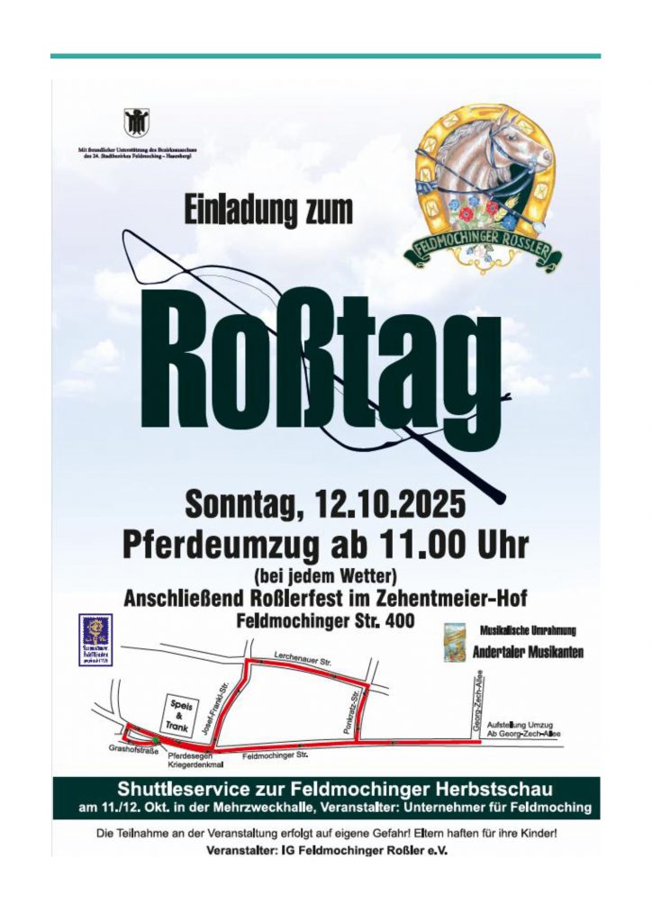 Herzlich Willkommen beim Gesamtverein Feldmoching Aktuelles Rosstag 2025 des IG Rossler e.V. Terminkalender Anschrift: Gesamtverein Feldmoching e.V.Georg-Zech-Allee 1780995 MünchenE-Mail: schriftfuehrer@feldmoching.net Datenschutzerklärung Impressum
