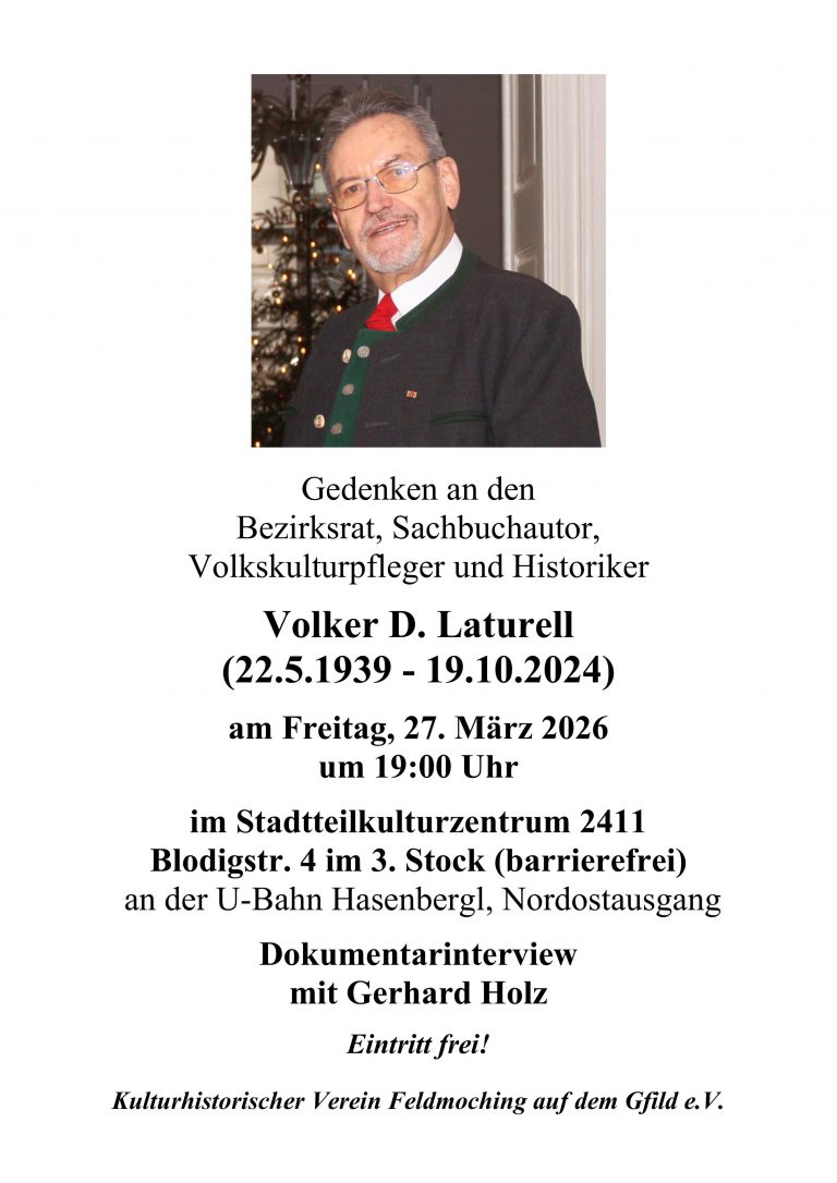 Herzlich Willkommen beim Gesamtverein Feldmoching Aktuelles Der Kulturhistorische Verein Feldmoching auf dem Gfild lädt zum Gedenken an Volker D.Laturell ein Terminkalender Anschrift: Gesamtverein Feldmoching e.V.Georg-Zech-Allee 1780995 MünchenE-Mail: schriftfuehrer@feldmoching.net Datenschutzerklärung Impressum